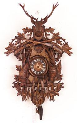 A large Black Forest weight-driven cuckoo clock with game and long gun carvings centering a stag's head. Circa 1885.
