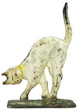 A Cat with Bow cast iron doorstop, 'Sculptured Metal Studios, 1928.' Unique design of cat with yellow bow, raised back with tail up. Extremely rare.
