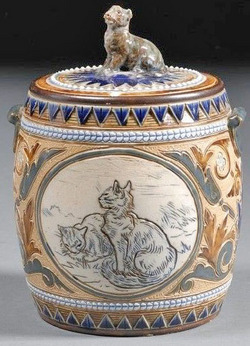 | | A Doulton Lambeth stoneware Hannah Barlow decorated biscuit jar, dated 1888, sgraffito decorated with two roundels of cats; image credit on full record. |