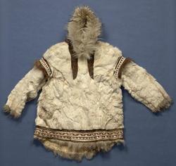 A Bathurst inlet Caribou umderbelly fur parka. With sinew-sewn seams and decorated with delicately cut dark and light fur trim further accented with r... [more detail available via subscription]
