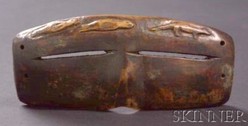 Eskimo carved ivory snow goggles, 19th century (?), with concave back and nose area, narrow slits for the eyes, four holes to attach head ties. Carved... [more detail available via subscription]