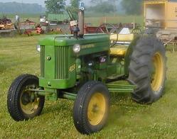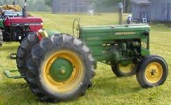 A mid to late 1950s John Deere Model 420 gas wide front utility farm tractor.