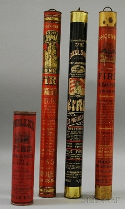 Four lithographed tin fire extinguisher canisters [dry powder type by various makers including one for automobile use], America, early 20th century.