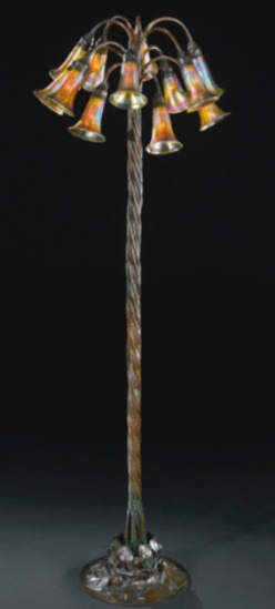 Tiffany Studios, twelve-light "Lily" floor lamp, each shade engraved L.C.T. Favrile, the base impressed TIFFANY STUDIOS / NEW YORK / 685. Favrile glas... [more detail available via subscription]