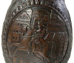 | A carved coconut with 3 oval panels depicting War of 1812 soldiers, Indians and harbor scene; image credit on full record. |
