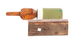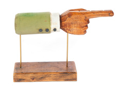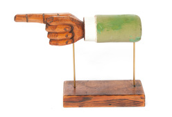 An American wooden hand, mid 20th century, carved hand with pointing finger and original paint. 10.5"h. 15.5"l. on base.
