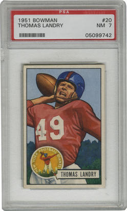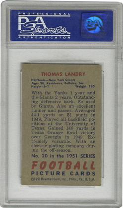 1951 Bowman Tom Landry #20 football card. Hall of Fame coach Tom Landry is seen here on his rookie player card that rates a solid Near Mint.