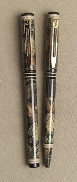 A Waterman Agora Series two piece set, includes a fountain pen #19197; ball pen #29197 multi colored green and beige, never used.