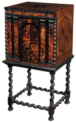 | An early Flemish Baroque tortoise shell and wood inlaid cabinet on a barley twist frame; image credit on full record. |