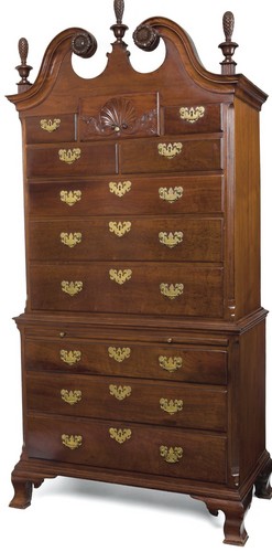 A mahogany Chippendale chest-on-chest, the broken-arch pediment with carved rosettes and pinecone finials, the drawers flanked by fluted quarter columns, Philadelphia origin; image credit on full record.