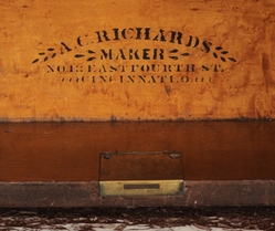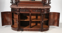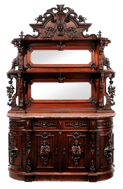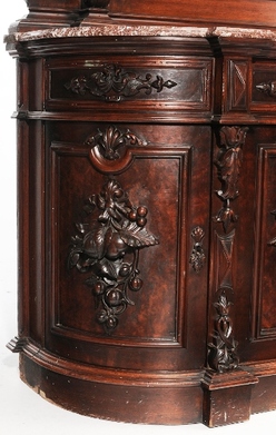 | Signed Cincinnati carved and figured walnut marble-top sideboard, Ohio, stenciled mark in two central drawers "A. C. Richards Maker No. 12 East 4th St. Cincinnati, O."; image credit on full record. |