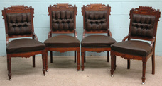 | | A late 19th century, seven piece Victorian Eastlake walnut horsehair upholstered parlor suite, view of side chairs; image credit on full record. |