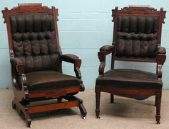 | | A late 19th century, seven piece Victorian Eastlake walnut frame upholstered parlor suite, view of platform rocker and armchair; image credit on full record. |