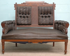 | | A late 19th century, seven piece Victorian Eastlake walnut frame upholstered parlor suite, view of settee; image credit on full record. |