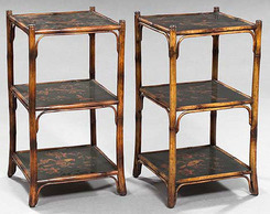 Furniture: A pair of Anglo-Indian style tiered tables, each with a square lacquered top with a polychrome avian scene, joined by bamboo supports to tw... [more detail available via subscription]