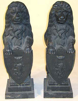 A pair of Continental cast iron lions, 19th century, modeled as rampant lions supporting a shield, raised on stepped square bases.