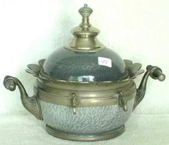 A granite ware covered butter dish with insert in American Gray with pewter scalloped trim and granite and pewter lid