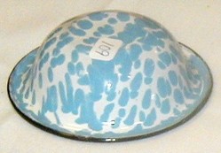 A blue and white wavy mottled graniteware sample or miniature washbasin.