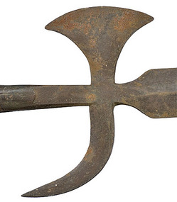 An American halberd and staff, iron spear with raised central ridge. Down turned beak protrudes out 3.5". Base includes a 6.5" conical base with two h... [more detail available via subscription]