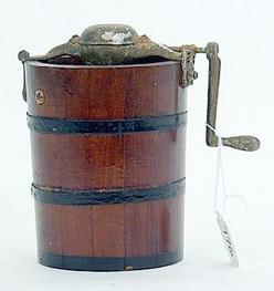 A miniature ice cream freezer marked Peerless Ice Land Freezer, wood with iron handle, tin staves and cylinder insert.