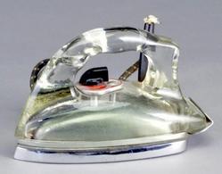 Saunders Silver Streak pyrex iron with clear glass, red enameled metal dial and black knob.