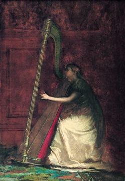 An oil on board painting by Eastman Johnson (American, 1824 to 1906). Lady Playing a Harp, initialed lower right.