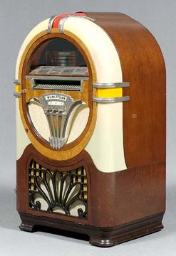 Model 750 Wurlitzer jukebox, Serial No. 745600, plays twenty-four 78 rpm records, tube type, front with bubble mechanism, original brass label on back... [more detail available via subscription]