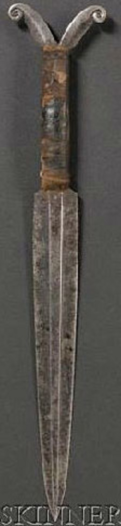 Athabascan forged metal dagger, third quarter 19th century, with central tapered ridge down one side of the blade, cloth wrapped handle with opposing ... [more detail available via subscription]