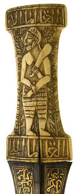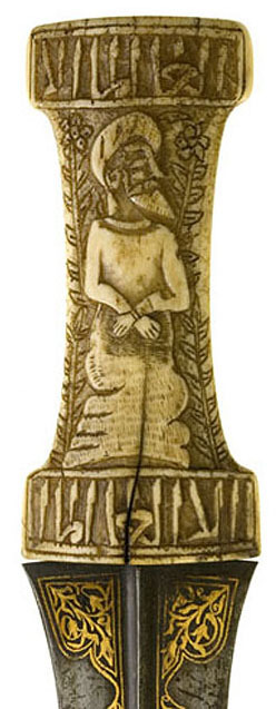 Detail of carved figure on the ivory handled dagger; image credit on full record.