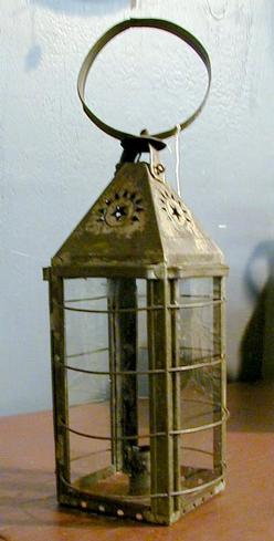 A early tin candle lantern stamped "Parker's Patent, 1855, Proctersville, VT", having glass panels on all four sides with wire protectors and a peaked... [more detail available via subscription]