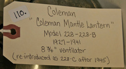 A Coleman Mantel Lantern, Model 228-228-B, 1927 to 1941, with 8.75" ventilator. Reintroduced as the 228-C after 1945.