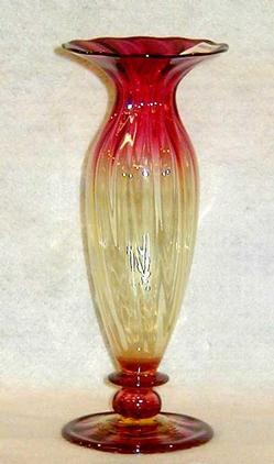 A Libbey Amberina ribbed vase. Etched Libbey in a circle mark. Round foot attached with water and ribbed knop. Flared rim. Very pale amber shading to ... [more detail available via subscription]