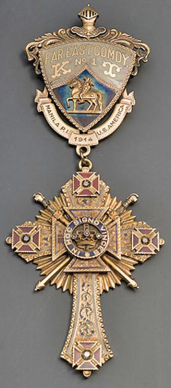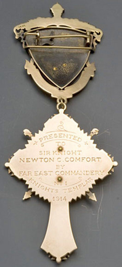 A Knights Templar York Cross of Honor pin presented to Grand Master Newton C. Comfort from Far East Commandery No. 1, circa 1914. Marked 14k gold with... [more detail available via subscription]