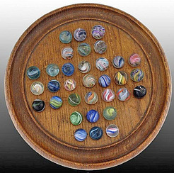 A Solitaire marble board game with nice mixture of marbles. Includes some swirls, Indians and onionskins.