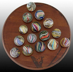 A small round tray with 15 marbles, No. 1113 Solitaire marble board with marbles.