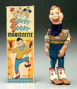 A Howdy Doody marionette doll. Molded composition body, manufactured by Peter Puppet Playthings, Inc Original pasteboard box.