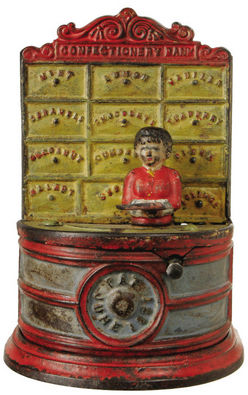 Confectionery Bank cast iron mechanical coin bank made by Kyser & Rex of Philadelphia, PA, designed by Rudolph M. Hunter, circa 1881. Deposit the coin... [more detail available via subscription]