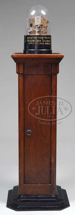 | An Edison Universal Western Union Telegraph Stock Ticker with stand and original pedestal stand; image credit on full record. |