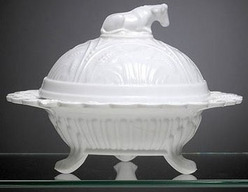 A rare British milk glass covered butter dish, cow finial, lid and footed base decorated with wheat, circa 1880.
