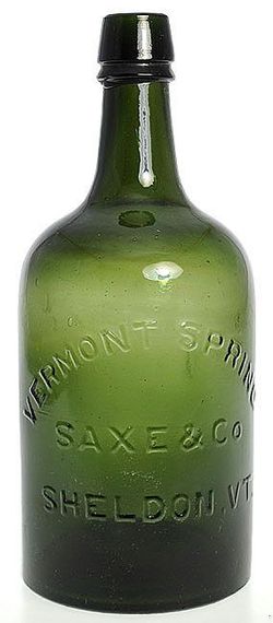 A Vermont Spring, Saxe & Co, Sheldon VT quart size mineral water bottle in medium olive green; image credit on full record.