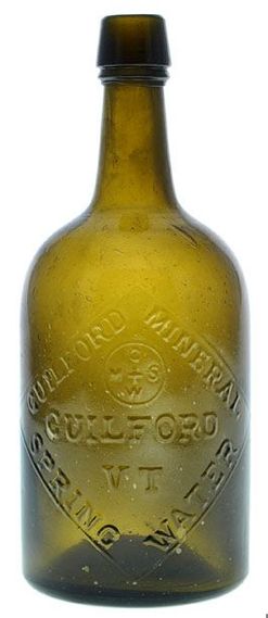 GUILFORD MINERAL / (GMSW monogram) / GUILFORD / VT. / SPRING WATER (inside diamond), Vermont, circa 1865 to 1875, yellowish olive green quart, ... [more detail available via subscription]
