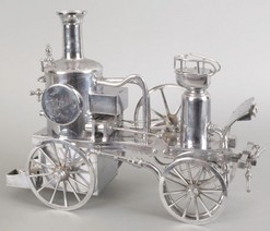 A nickel plated model of a circa 1860 horse drawn steam fire engine, early to mid 20th century, inscribed Franklin [fire or firemen's steam pumper wag... [more detail available via subscription]