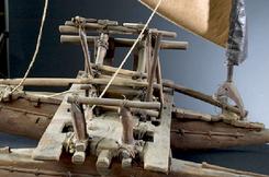 A model of the Polynesian Kon-Tiki with mainsail and 2 floats; image credit on full record.