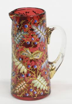 A Moser cranberry pitcher with applied handle, enameled in insect and foliate motif, circa 1885.