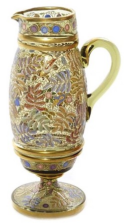 A Moser footed water pitcher having a barrel shape in translucent green glass decorated with variegated blue, red, green, and yellow and leaves and be... [more detail available via subscription]