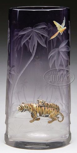 | An extremely rare Moser glass Tiger decorated vase, clear to amethyst, tigers standing amongst intaglio carved palm trees with a colorful applied parrot flying above; image credit on full record. |