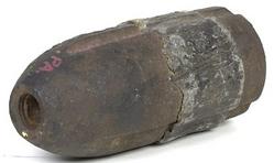 A Hotchkiss Civil War 3" artillery shell from Gettysburg, fuse plug removed. Tight lead sabot which is squeezed into the rifling when fired; shell emp... [more detail available via subscription]