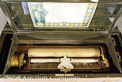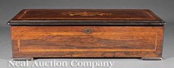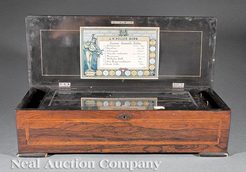A Swiss inlaid rosewood cylinder music box, early 20th century, top inlaid with trophee, manuscript label from "J.H. Heller, Bern" indicating the eigh... [more detail available via subscription]