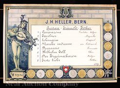 | | A Swiss inlaid rosewood cylinder music box, early 20th century, top inlaid with trophee, manuscript label from "J.H. Heller, Bern" indicating the eight aire selections; image credit on full record. |