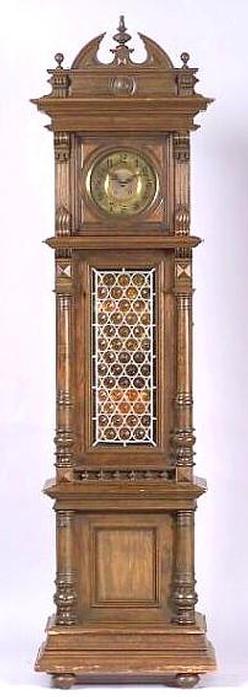 A Polyphon long case clock with 15.5 inch twin-comb mechanism in trunk, two-train clock movement striking on gong, and brass face with Arabic numerals... [more detail available via subscription]